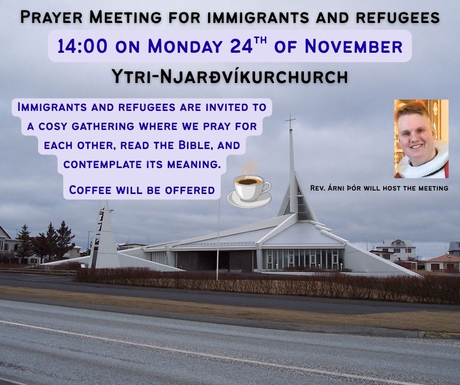 Immigrants and refugees are invited to cosy gathering, where we will pray for each other read the Bible and contemplate its meaning. Coffee will be offerd. REV. Árni Þór will host he meeting